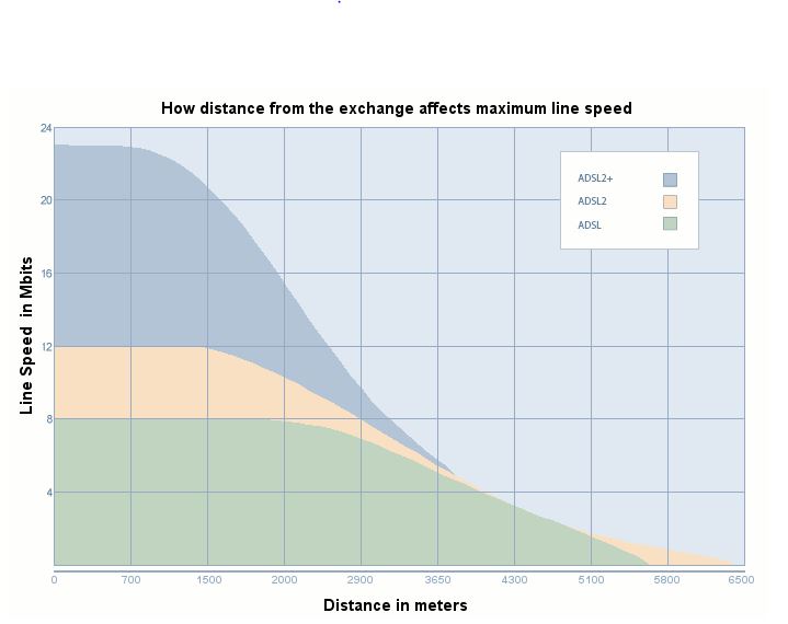 The accepted figures for how line speed falls off with distance are shown in the graph - the "flavours" of ADSL are the technologies that are used to encode the data on the phone line. Currently most if not all people in Sambourne use ADSL. If we accept a wire length of 2 km then from the graph, the data rate using ADSL should be almost 8 Mbps - 50% higher that currently available.